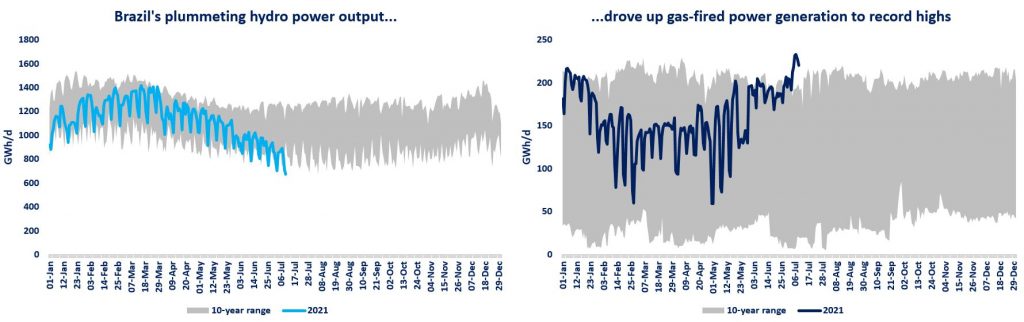 The drought in Brazil is testing the country’s power system: whilst power generation needs climbed by 10% yoy so far in 2021, hydro output is plummeting (-10% in June) on low rainfall and reservoir levels.