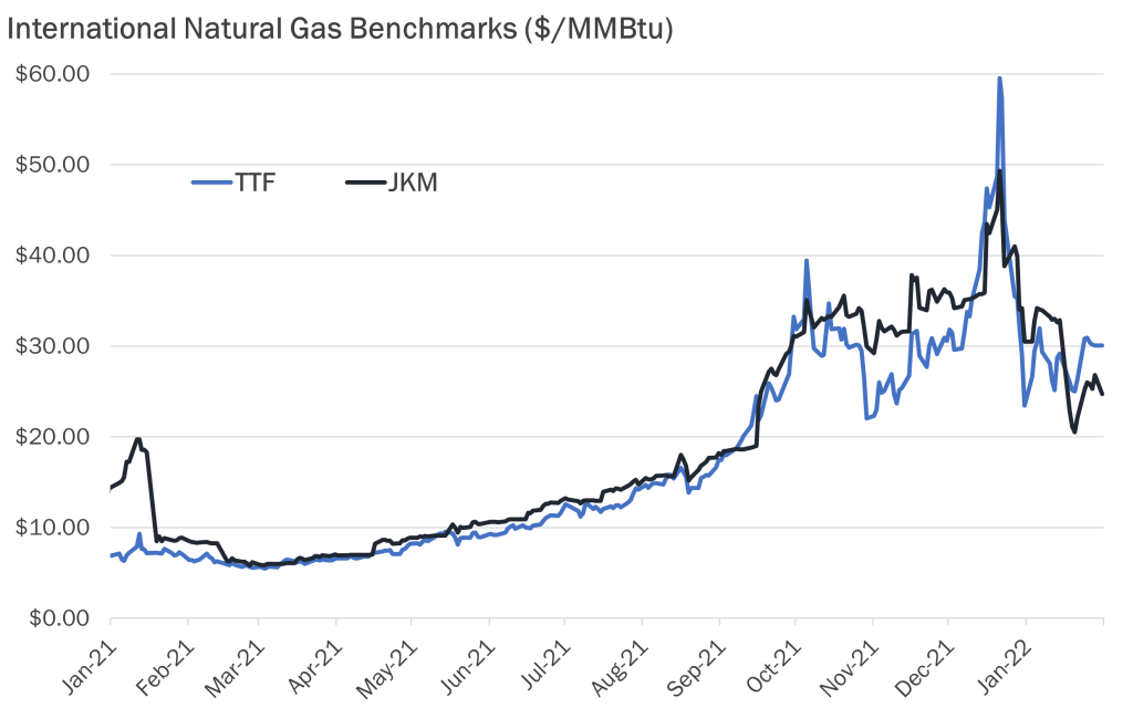 Since the runup to $60 gas prices in mid-December, international benchmarks have steadily fallen, with the European TTF having spent the last month in a consolidation range between $26 and $30.