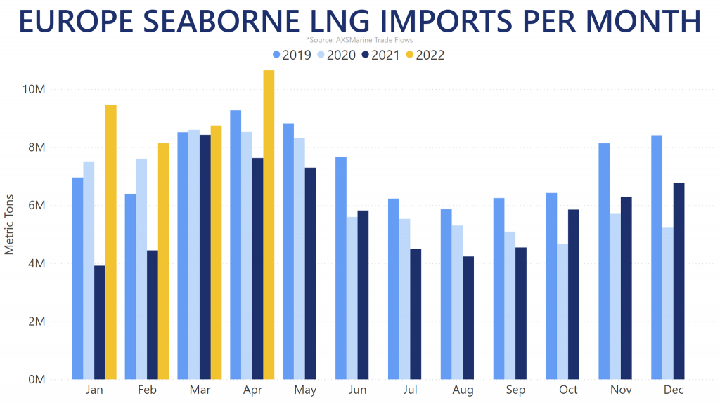 Europe-bound LNG volumes at sea remain high and current discharges in May stand at 55% higher compared to 2021 levels.