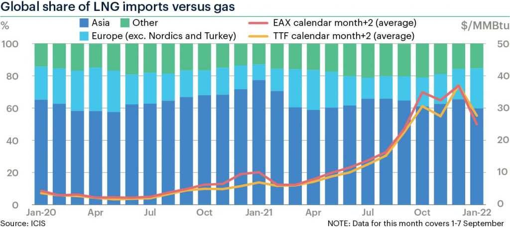 Europe accounted for a ????????% share of global LNG imports, six percentage points higher than December’s levels, and the highest January ever.