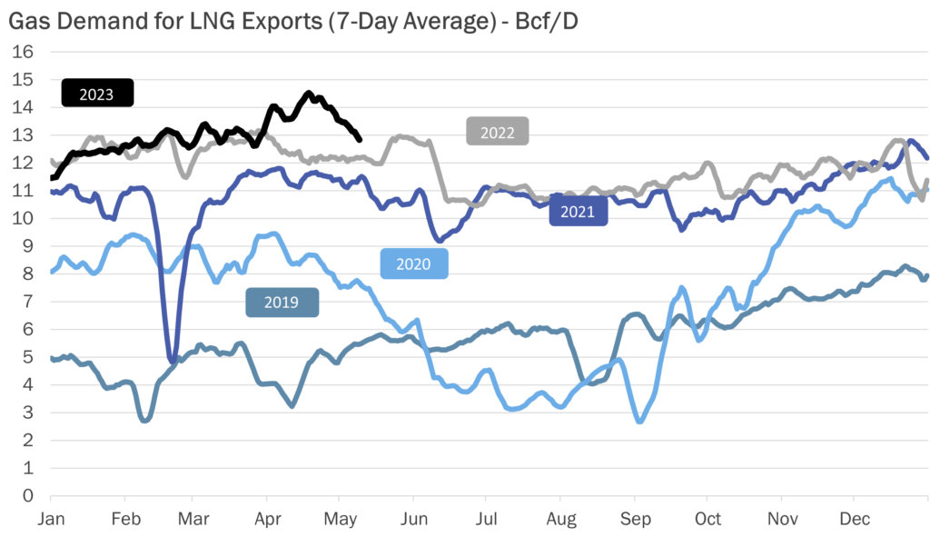Gas flows to US LNG export plants have dropped to near 12 Bcf/D so far, continuing the decrease from the highs in April.