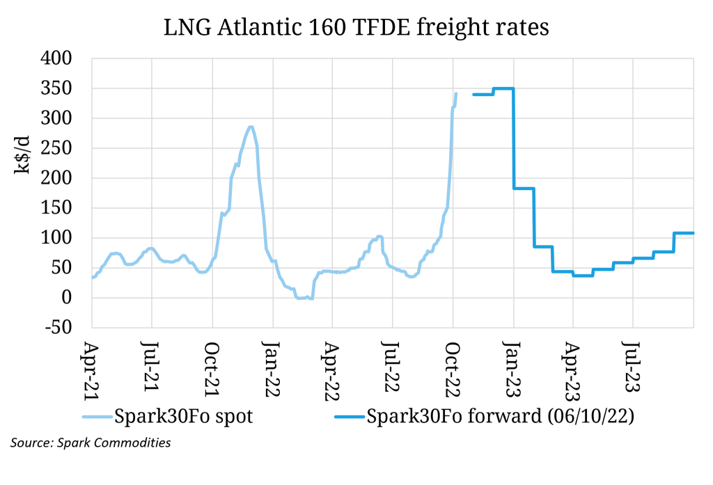 While this contributed to the collapse in charter rates in early 2022, the Spark Atlantic spot freight assessment (30S, 160 TFDE) has reached a record high of 341 k$/day, after climbing sharply through September.
