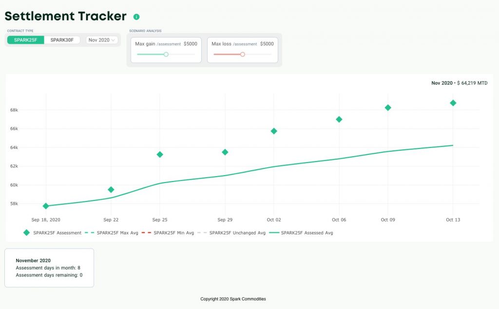 Spark25F (Pacific) November contract settles at $64,219/day. Consistent bullish sentiment was reflected on each assessment day throughout the settlement window.