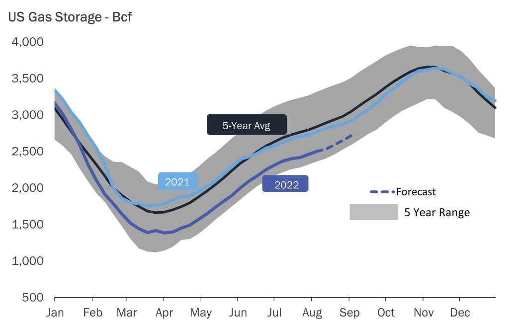 This morning (Thursday), the Energy Information Administration (EIA) will publish its weekly natural gas storage data report for the week ended August 12. Market estimates are for a storage build that is wide-ranging from as little as 19 Bcf to as much as 45 Bcf.