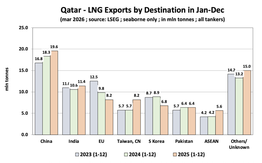 Qatar’s exports grew by +5.1% y-o-y from 77.2 mt in 2024, but volumes have remained relatively flat in recent years. In terms of destination markets, Asia dominates: