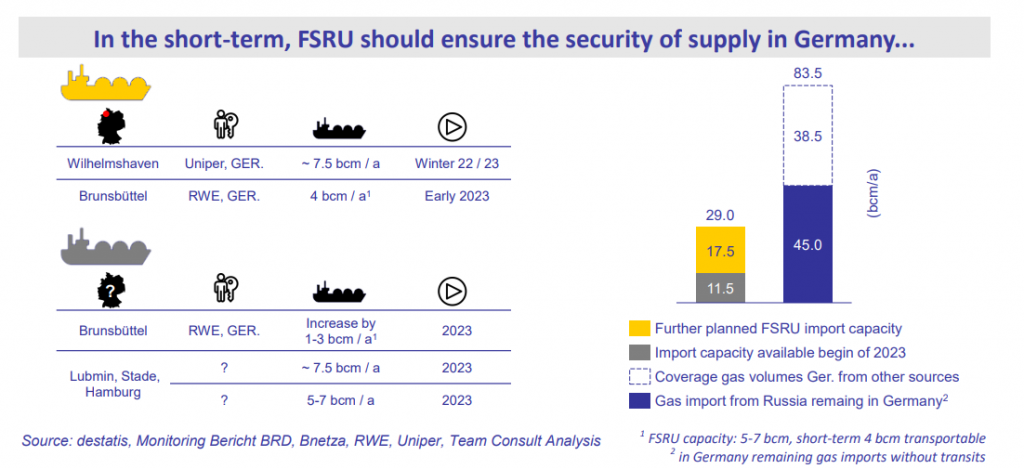 To ensure security of supply in the short-term, Germany charted four floating LNG Terminals (FSRU). Assuming a maximum utilization of the four ships, they could partly replace Russian gas volumes in case of a complete stop of deliveries within the next 12-24 months.
