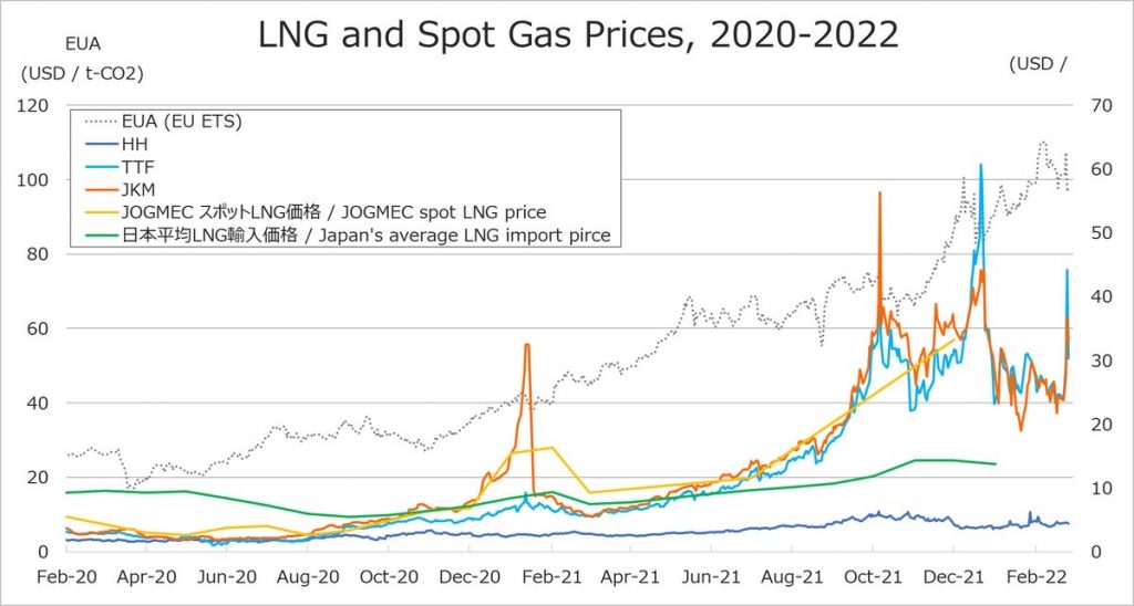 The Japan’s average landed crude oil import price (JCC: Japan crude cocktail) declined to USD 79.64 in January 2022 from the previous month but remains high. Japan’s average LNG import price is expected to continue rising, as long-term contracts linked to JCC prices still account for 70%-80% of LNG imports.