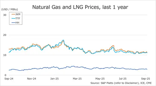 One-year chart of global gas prices showing JKM, TTF and Henry Hub trends from November 2024 to November 2025.