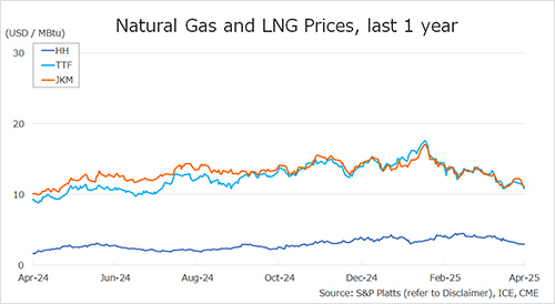 One-year chart of global gas prices showing JKM, TTF and Henry Hub trends from November 2024 to November 2025.