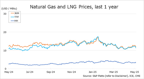 One-year chart of global gas prices showing JKM, TTF and Henry Hub trends from November 2024 to November 2025.