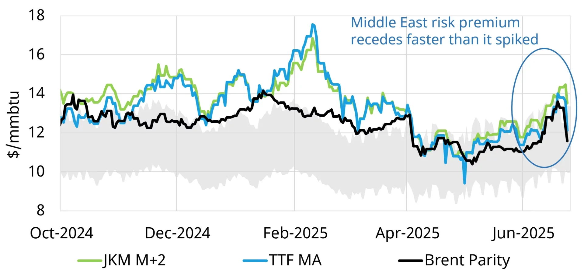 One-year chart of global gas prices showing JKM, TTF and Henry Hub trends from November 2024 to November 2025.